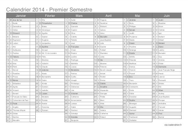 Calendrier 2014 Semestriel Avec Fêtes Des Prénoms